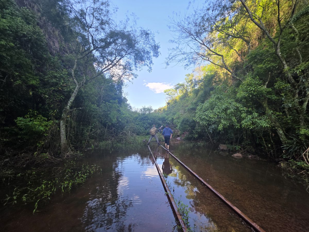 Além disso, o caminho de ferro some em vários pontos devido ao acúmulo de mato. Até cana-de-açúcar está crescendo entre os dormentes. Efeito de mais de ano de abandono por parte da Rumo Logística – concessionária que sequer fez a limpeza básica dos trilhos após a tragédia climática de 2024.