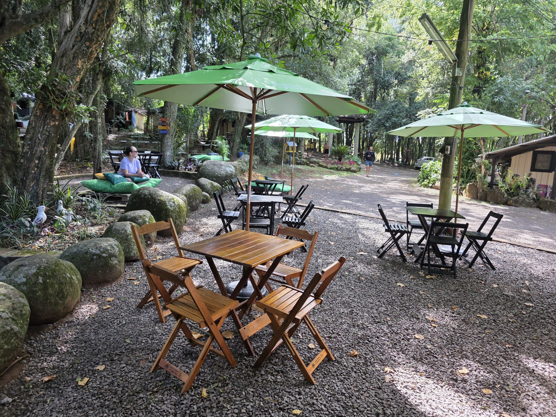 Uma delas é o bar com estilo de bier garden com mesas, ombrelones e pufes espalhados na natureza. Além das bebidas, atende com uma série de porções, lanches e pratos prontos nas noites de sexta-feira e no fim de semana, quando o camping abre ao público.