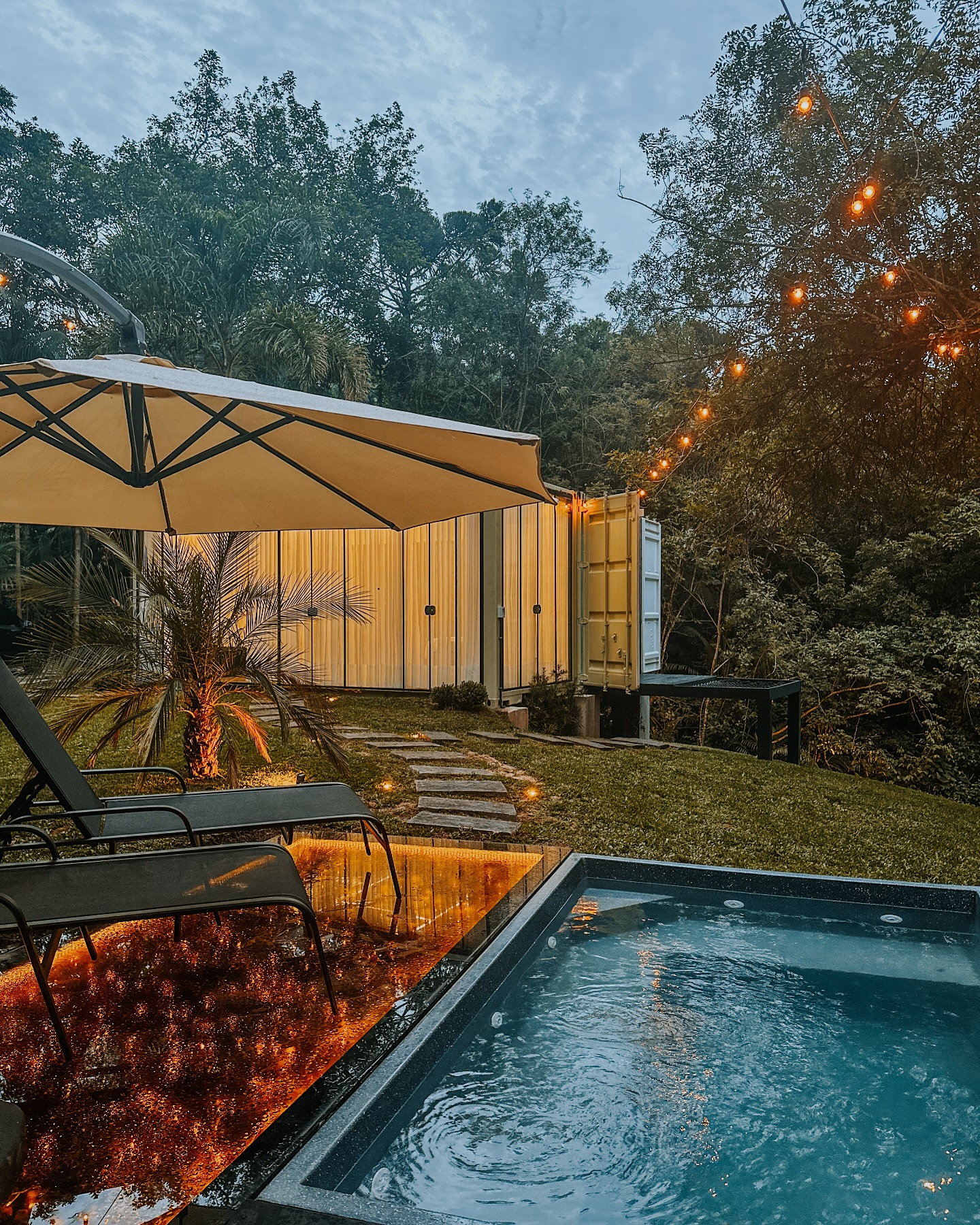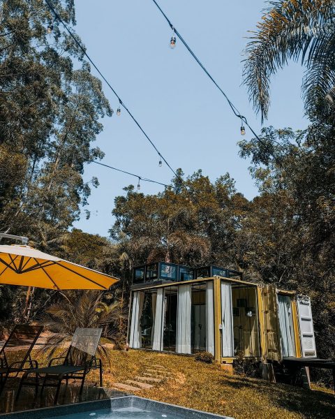 Oferece hospedagem em container ou cabana, com opção de adicionar passeio de quadriciclo e cavalos;