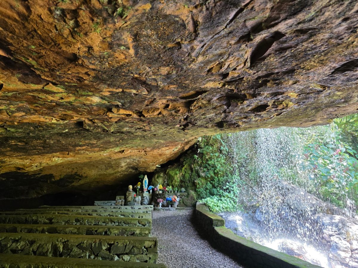 O charme fica para uma pequena cascata de frente a gruta. O caminho até lá também é deslumbrante com a estrada passando pela vegetação verde e árvores. O acesso é gratuito.