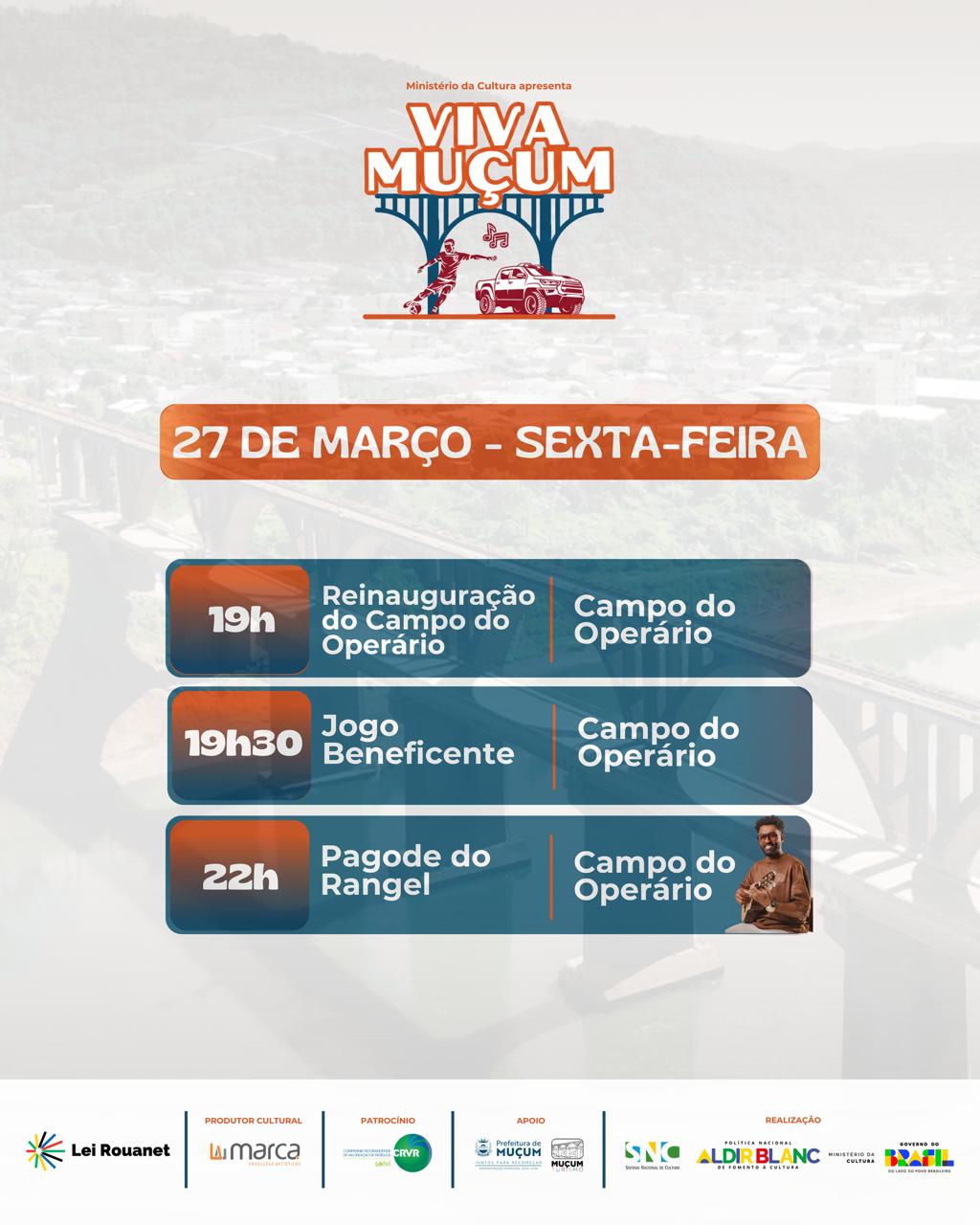 A abertura acontece na sexta-feira, 27 de março, no Campo do Operário. Às 19h ocorre a reinauguração do espaço esportivo, uma das obras de restabelecimento mais aguardadas pela comunidade. A programação segue com um jogo beneficente em prol dos muçunenses Julinho Ribeiro e Miguel Coleti, às 19h30min. Para encerrar a noite, o público poderá aproveitar o show do Pagode do Rangel, a partir das 22h.